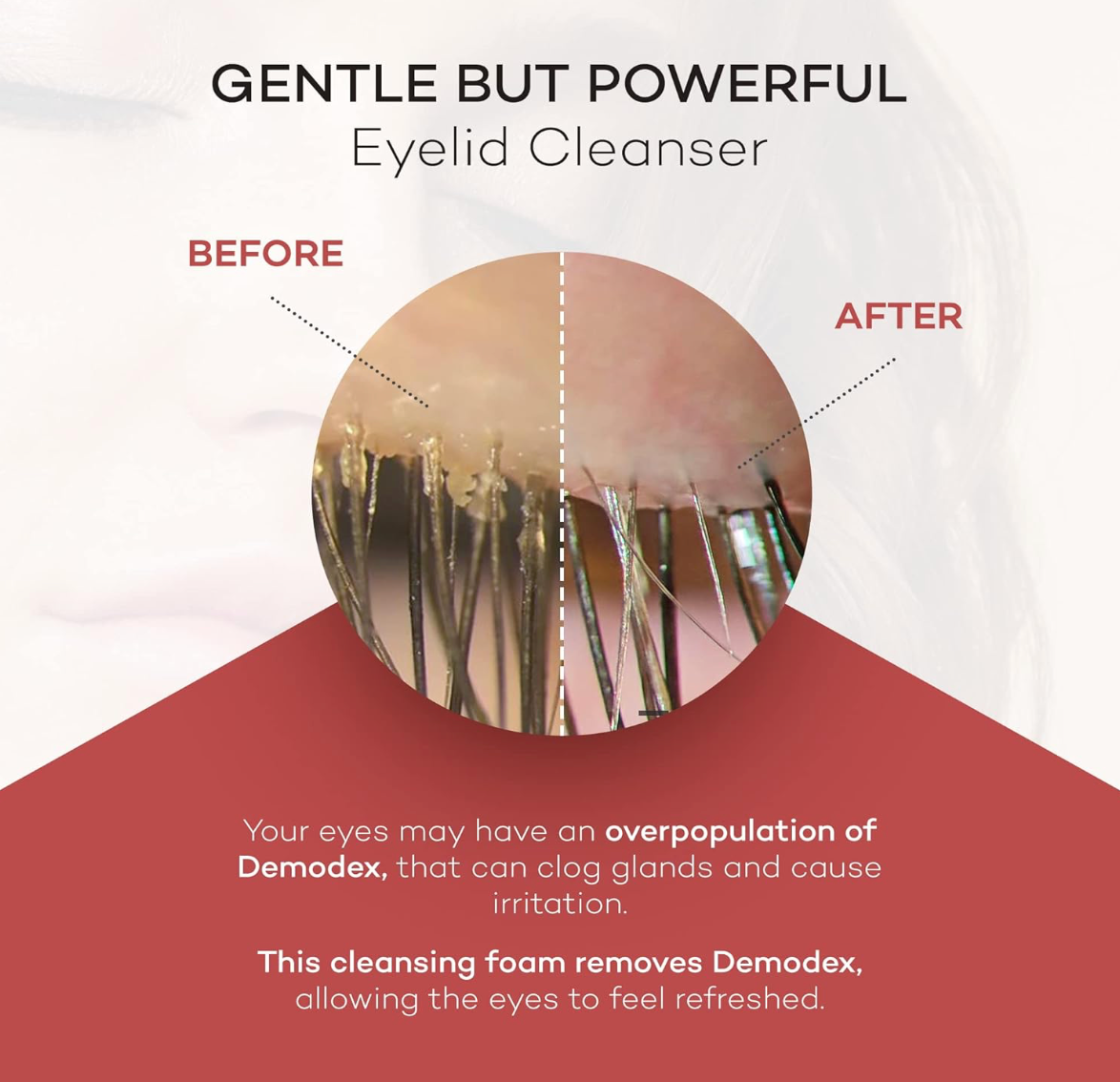 • A gentle but powerful eyelid cleanser leaves dry eyes feeling refreshed and energized. Your eyes may have an tartar-like biofilm residue that can clog glands and cause irritation. This foam removes eyelid residues, allowing the eyes to feel refreshed.